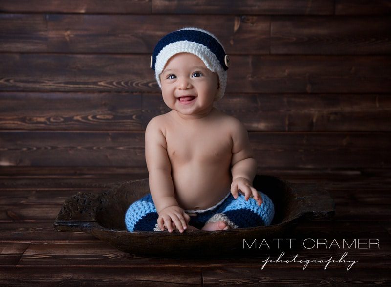 Actually, when his mommy first contacted us for a session when he was three months old, she asked for some advice regarding the best timing for a session with us.  Our next age after newborn that we used to photograph was right around three months……..however, we have since stopped offering sessions at this age, as it has proven to be an especially difficult age to photograph.  Separation anxiety begins to set in around this time and for most babies, it’s just a really tough session with quite a bit of crying.  At this age, we are also limited to photographing baby on their backs only, as their neck control is still developing and of course they can’t sit up on their own.  We now recommend to all parents to wait until 6-9  months for what we call the “sitting up” session.  This is an awesome milestone session, as baby is sitting up by themselves, giving lots of expressions, yet they are still not mobile!  It is our favorite age by far to photograph!  For this session, we do always want baby to be sitting up completely unassisted.  For some babies this is right at six months, for others it can closer to seven, even eight, months. The key is that they can sit and hold themselves up by themselves.  If baby is not able to do this, then we would prefer to wait on the session.  We provide all props for our sitting up sessions- baskets, crates, blankets, rugs, etc.- we have quite a lot!