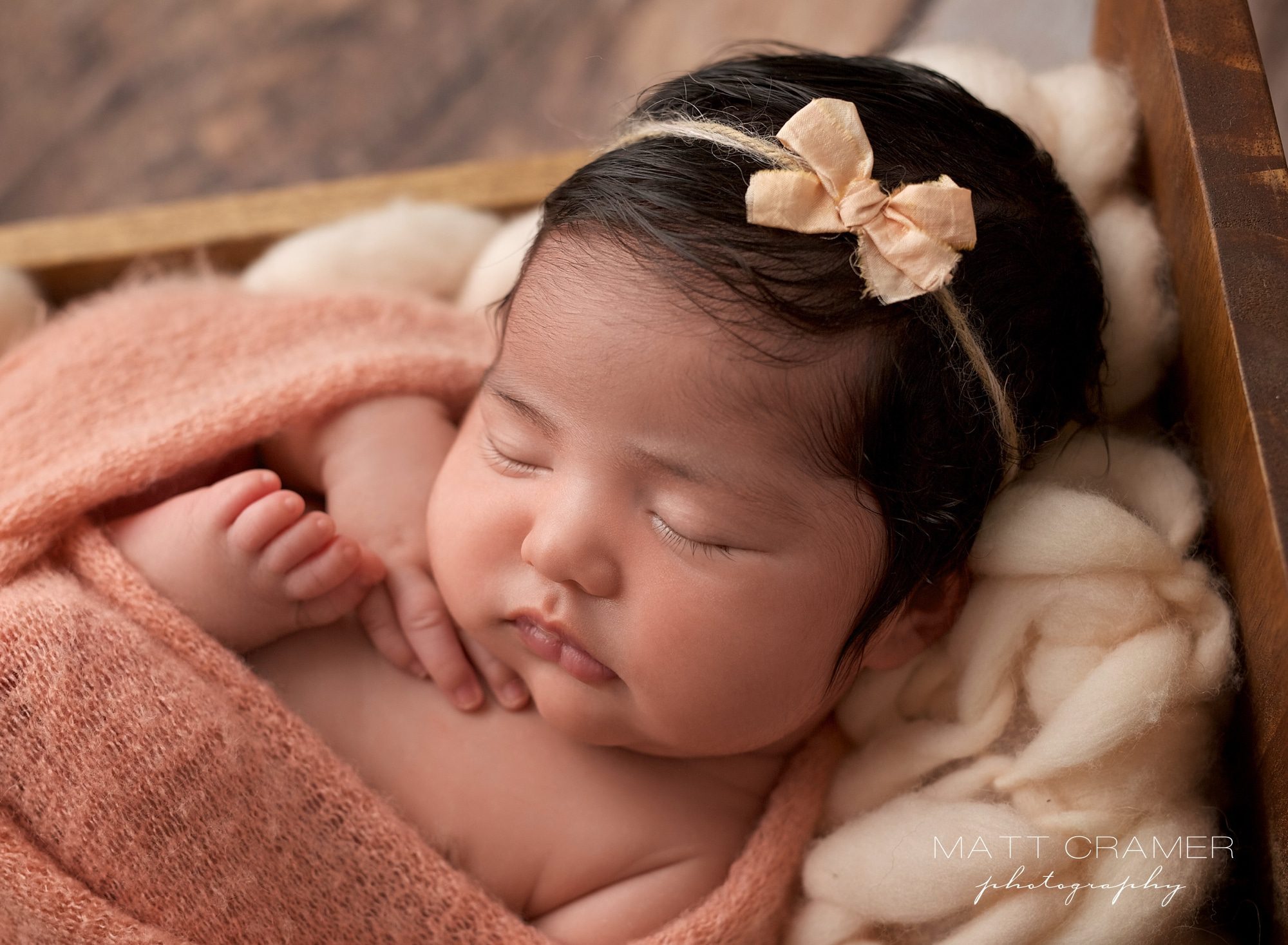 Newborn Photographer Near Me Los AngelesThis look is using our handmade wood baby bed. A top pick from parents! Her little hand placed so delicately under her chin is too cute.