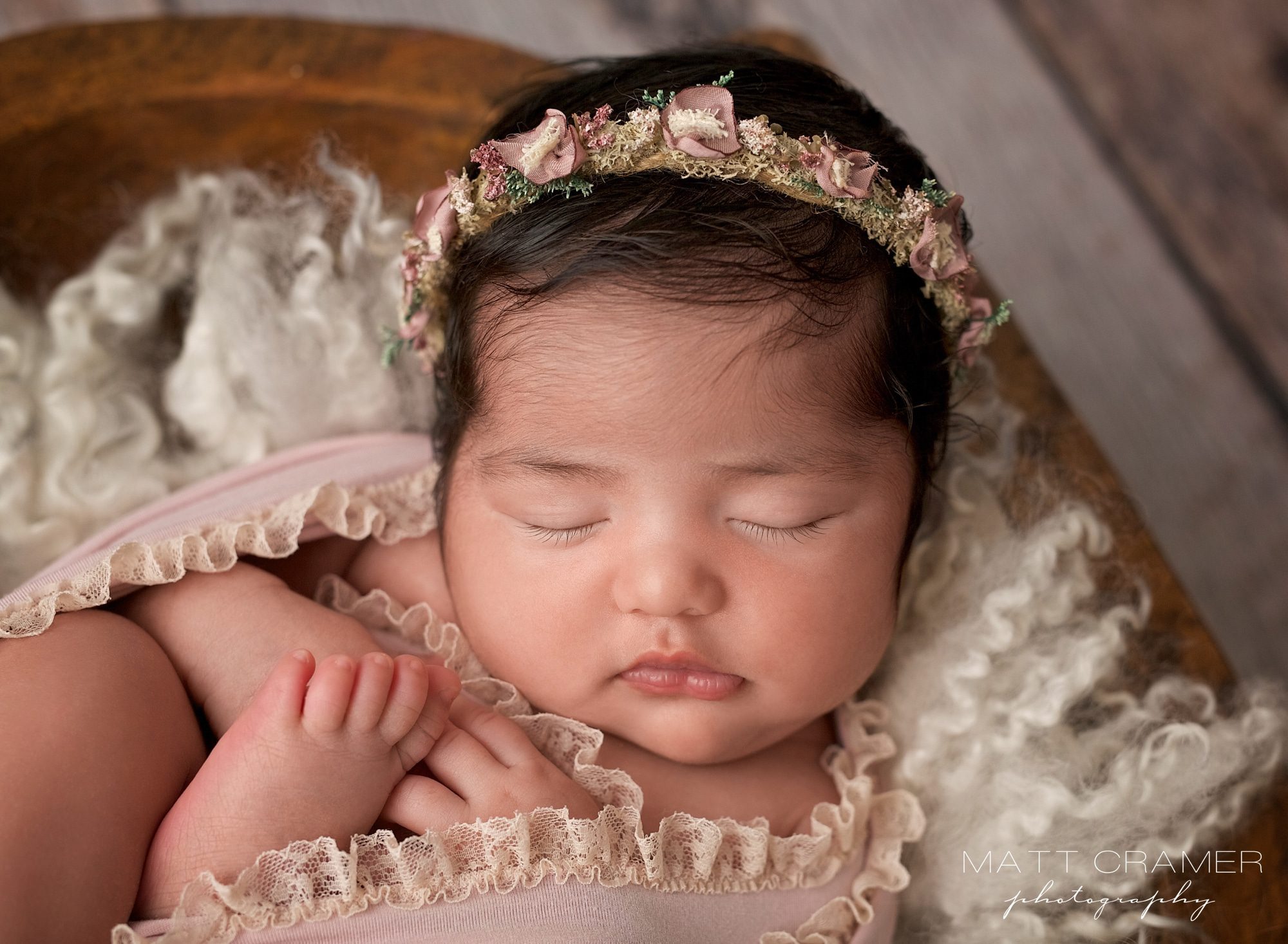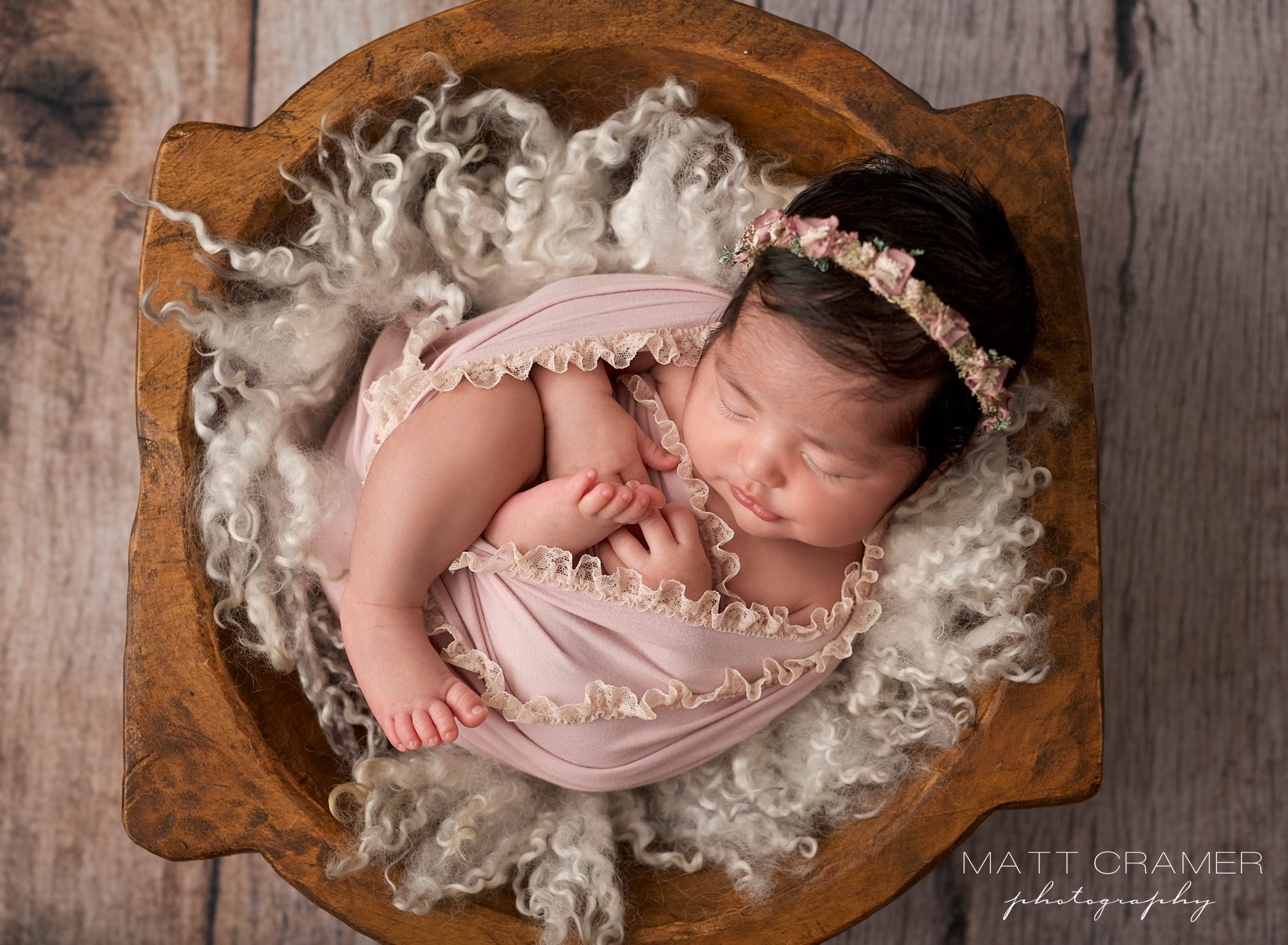 Newborn Photographer Near Me Los AngelesBigger babies fit perfectly into our chunky wood dough bowl. I love using this lilac ruffle wrap too! It matches perfectly back to our dried floral crown.