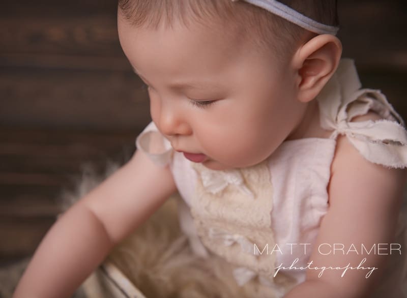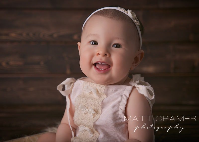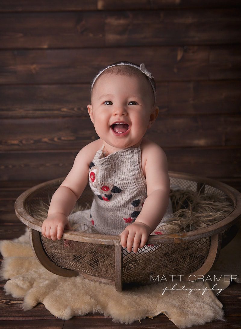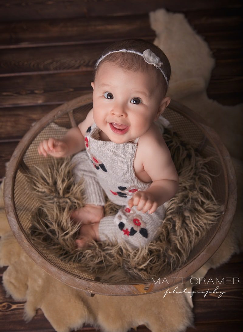 The Sitting Up session! After our newborn photography sessions, our favorite session is called the “Sitting Up Milestone” session. age to photograph little ones is between 6-9 month olds. Why, you ask? Well, because you usually get LOTs of adorable expressions, BUT (and this is very important) they can’t move yet! 🙂 So we end up being able to capture all their cute faces in a few different set ups, but without having to chase them around the studio. For this session, we always want baby to be sitting up completely unassisted. For some babies this is right at six months, for others it can closer to seven, even eight, months. Some parents will inquire about a “Six Month Milestone” session, but the key is that they can sit confidently and hold themselves up completely on their own- not their exact six month mark. If baby is not able to do this, then we would prefer to wait on the session. We provide all props for our Sitting Up Milestone sessions- baskets, crates, blankets, rugs, etc.- we have quite a lot! We also provide all outfits too- we have a huge supply of adorable rompers, handmade outfits, hats, bonnets, headbands, etc. Parents do not need to bring anything at all to the session, actually!